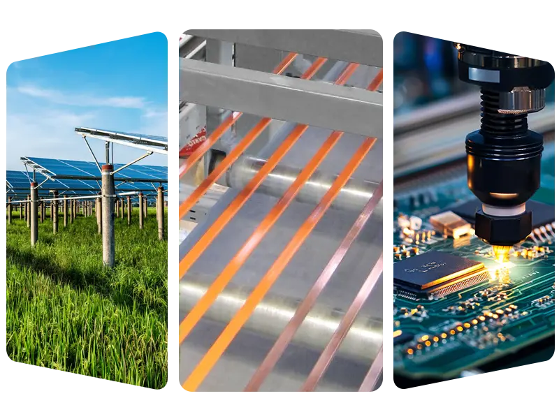 • Fotovoltaïsch veld: massaproductie van fotovoltaïsche laslinten en -rails om componenten te helpen elektriciteit efficiënt te geleiden.